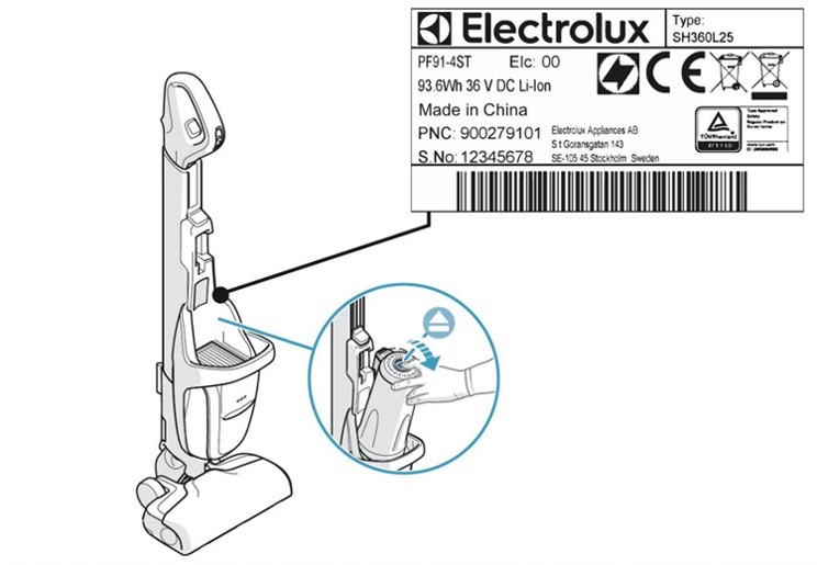 - Les informations Modèle , numéro de produit (PNC) et numéro de série figurent sur la plaque signalétique placée derrière le bac à poussière de l'aspirateur.
