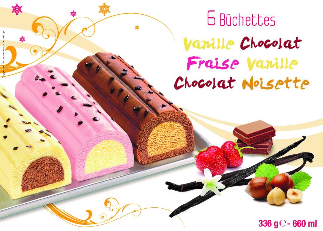 - 6 buchettes : Vanille Fraise ; Chocolat Vanille et Noisette chocolat