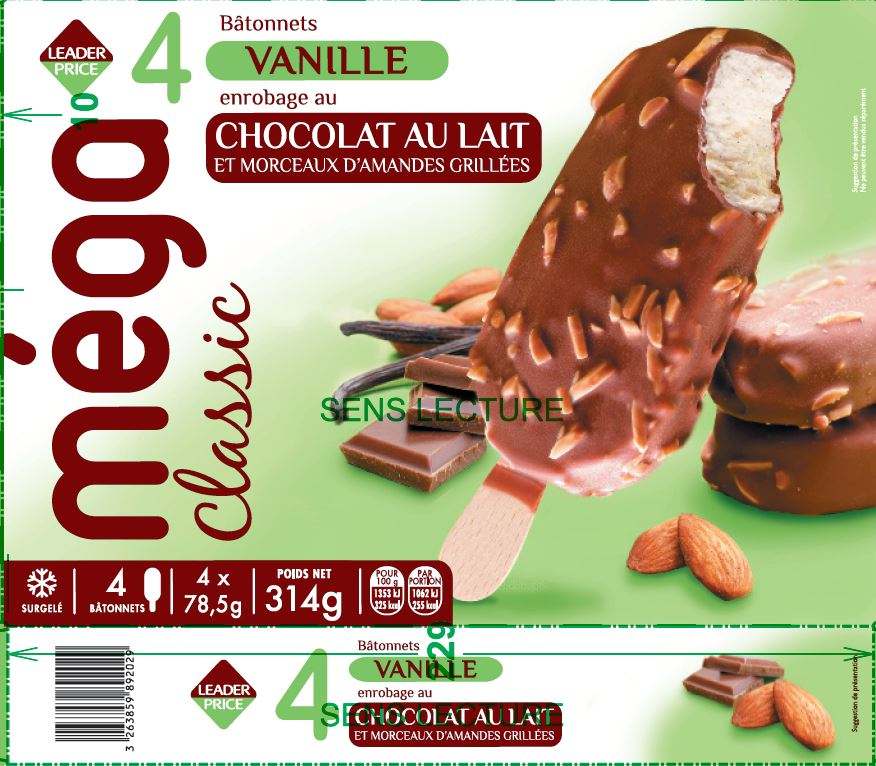 Méga classic Bâtonnets vanille enrobage chocolat lait/amande x4 Leader Price 314g