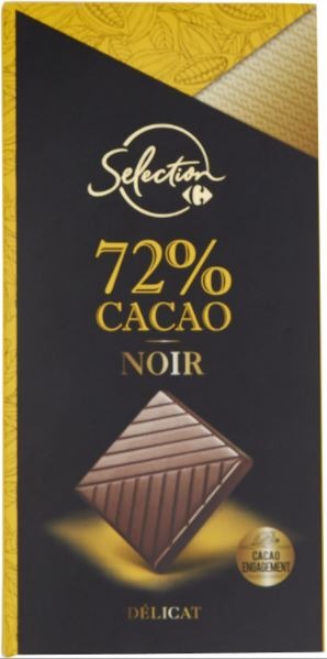 - Présence d'allergènes non indiqués. Tablette chocolat noir mangue poivre Sichuan emballé dans étui chocolat noir 72% cacao.