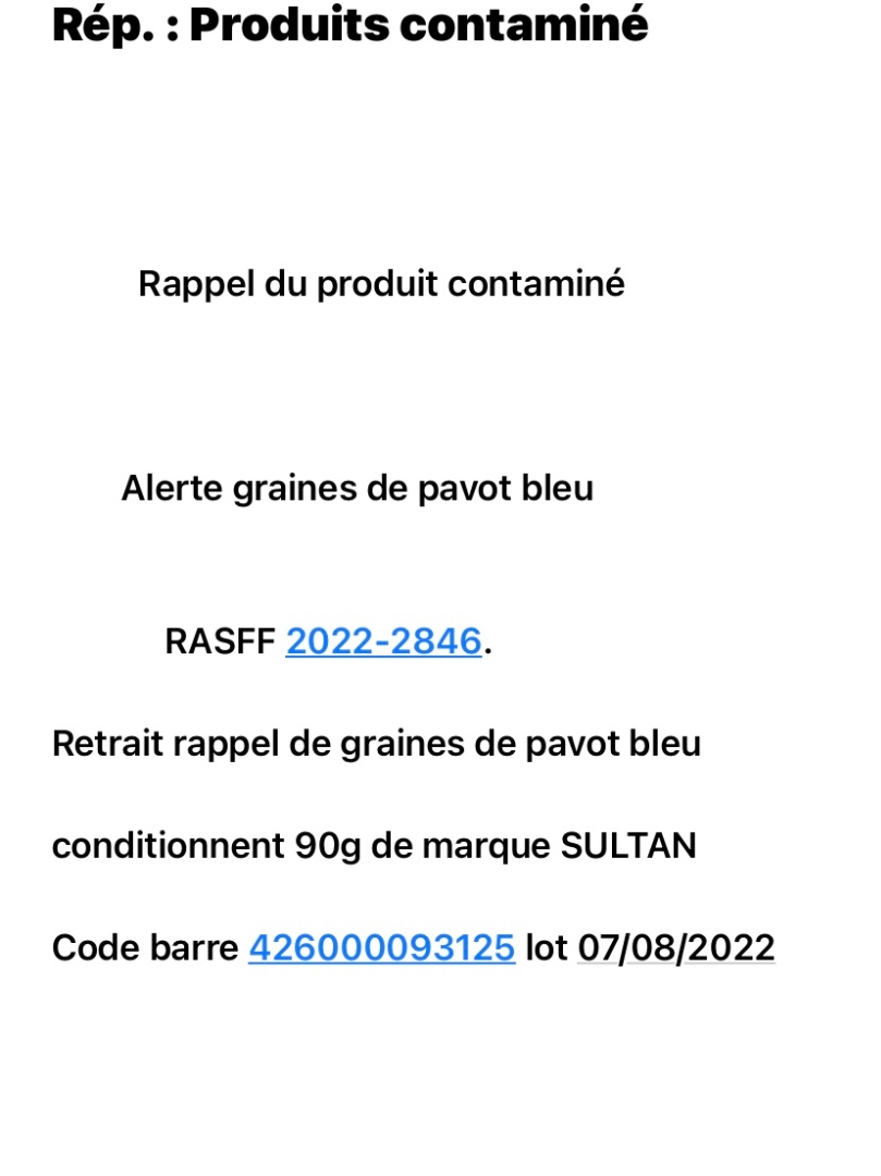 - graines de pavot bleu 90 g de marque SULTAN code barre 426000093125 LOT 07/08/2022