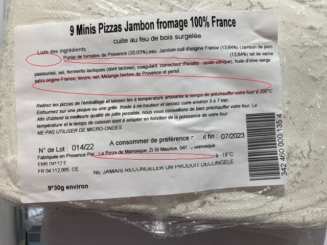 - 9 mini pizzas au jambon fromage emballées dans une barquette compostable de couleur blanche. L'ensemble étant emballé à l'aide d'un film transparent et identifié avec une étiquette adhésive mentionnant la liste d'ingrédients, lot et DDM.