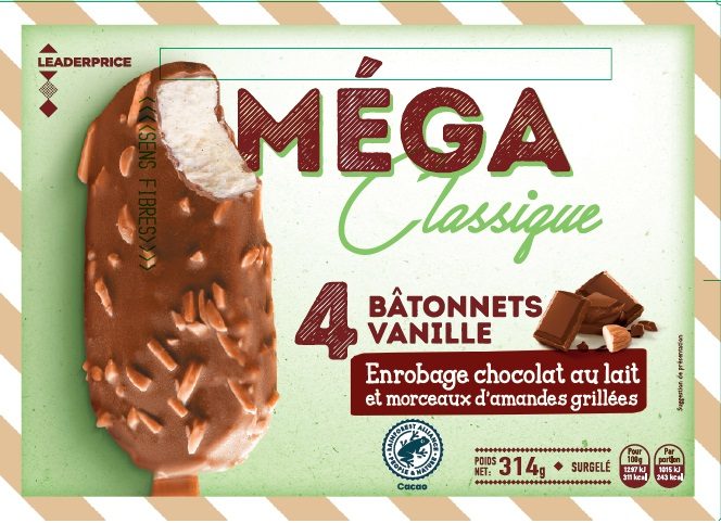 - MEGA Classique 4 Bâtonnets Vanille chocolat lait amandes 314g Leader Price - EAN 3263859892098