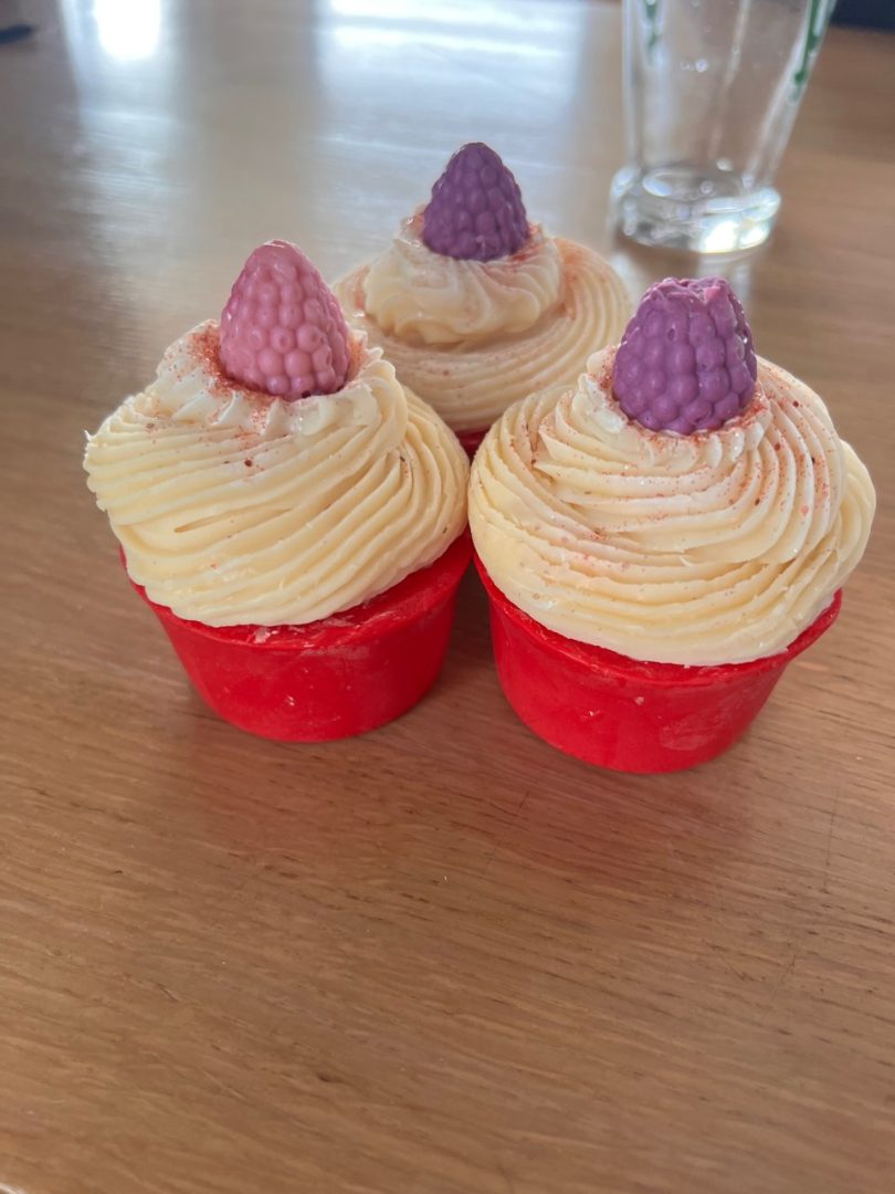 - SAVON EN FORME DE GATEAU CUPCAKE AVEC UN SAVON EN FORME DE FRAMBOISE.