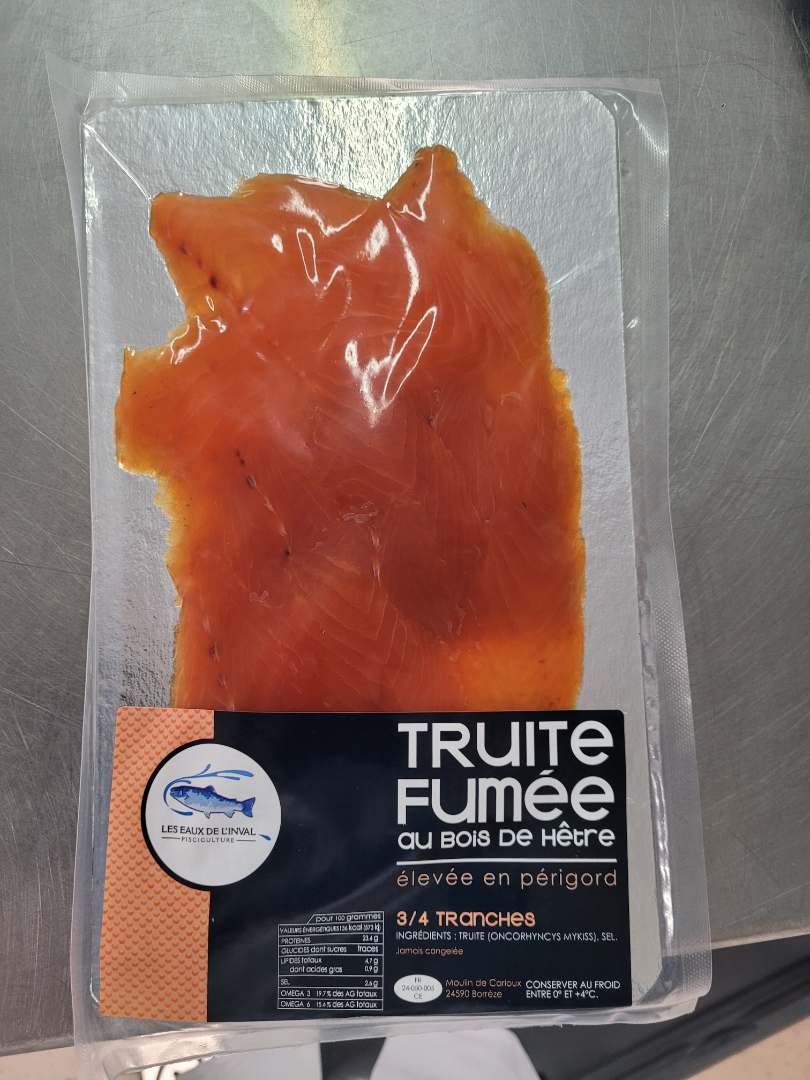 Identification des produits GTIN Lot Date 21258120 Truite fumée 3/4 tr nature Date limite de consommation 26/09/2022 21258160 Truite fumée 3/4 tr 5 baies Date limite de consommation 26/09/2022 21258150 Truite fumée 3/4 tr Aneth Date limite de consommation 26/09/2022 29694220 Chiffonnade de truite Fumée 200 gr Date limite de consommation 26/09/2022 23147850 Filet de truite fumée à la Ficelle Date limite de consommation 26/09/2022 - Conditionnements