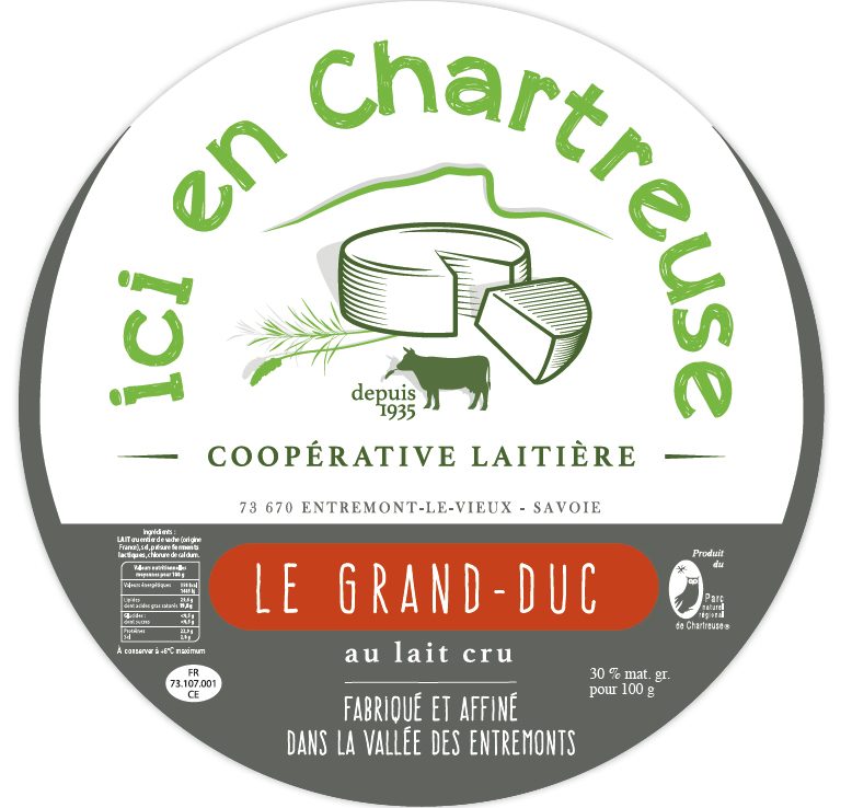 - Produit : Fromage au lait cru Marque : Ici en Chartreuse Type : Grand-Duc Lot : 12022 Conditionnement : vrac ou fondue Date de commercialisation : 06.11.2022 Date de fin de commercialisation : 15.11.2022 N° agrément sanitaire : F-73-107-001 C.E