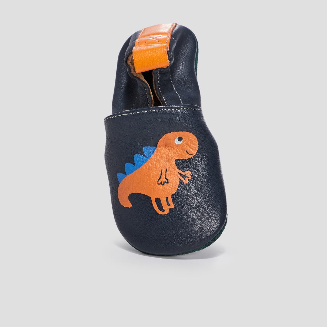 - Paire de chaussons en cuir marine, avec motif dinosaure