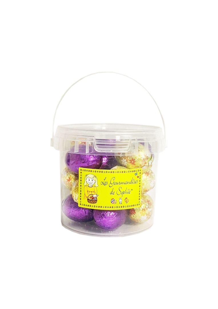 - Petit seau en plastique transparent contenant des œufs emballés avec un aluminium violet et un aluminium jaune avec des petites fleurs blanches et oranges.