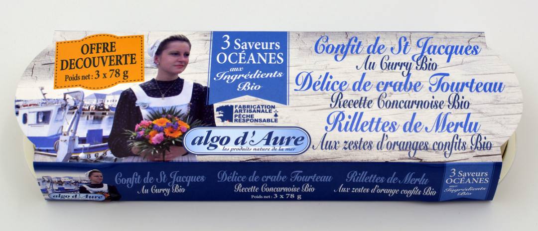 - Dans cet étui de 3 boites 1/10 de conserves de la mer aux ingrédients bio 78g , une boite est concernée : c'est le "Délice de crabe tourteau, recette Concarnoise"