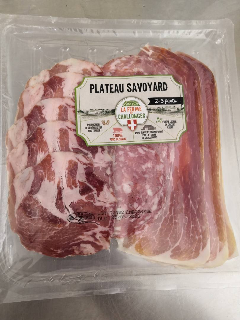 - Barquette transparente avec étiquette commerciale "PLATEAU SAVOYARD" avec le logo "LA FERME DE CHALLONGES".