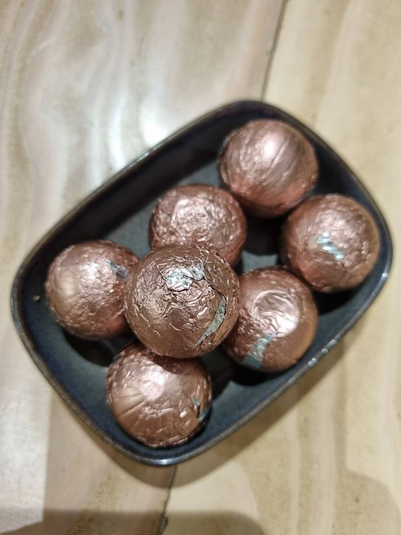 - Perle en chocolat au lait fourrée de crème au chocolat, emballée dans un papier alu marron clair vendue en vrac